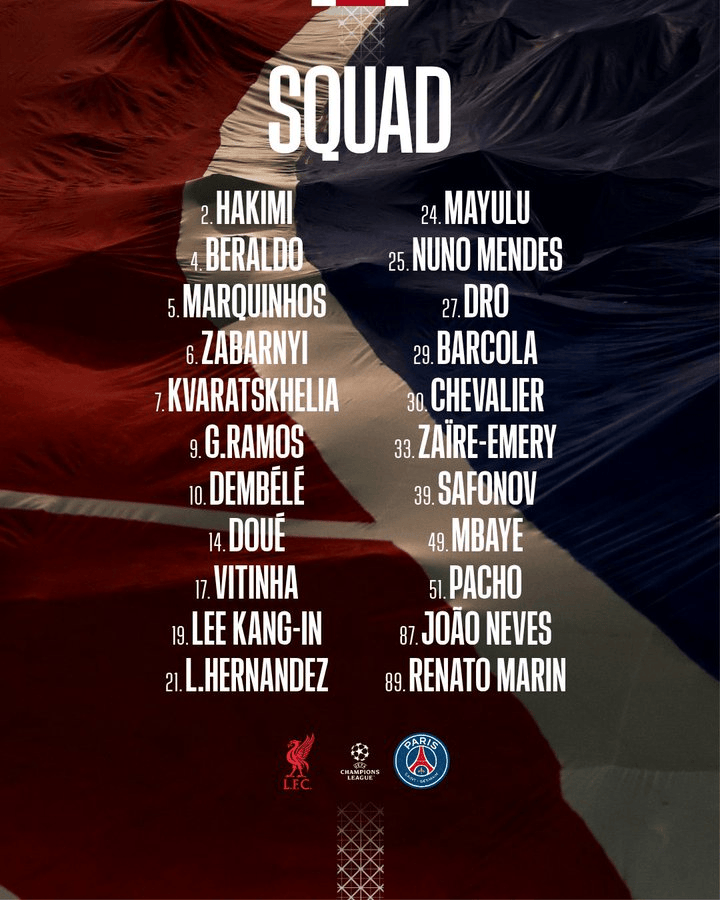 [流言板]巴黎vs利物浦大名单:登贝莱,K77,杜埃领衔;巴尔科拉回归